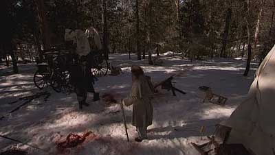 His “beware of them hills” dialog is just what we need just in case we thought the trip was going to be roses and daises. What they don’t know, at least at first is that the location is right in the area where the infamous Donner Party was stationed due to bad weather. The story goes they went crazy and started chopping folks up for food. Not the kind of meal anyone wants to become a part of …but things tend to get off balanced when stranded in the mountains with no food on hand.