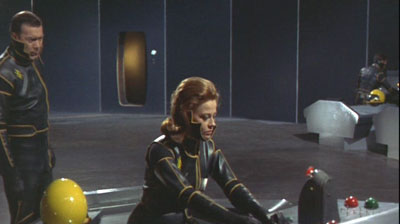 Probably the first thing that strikes your eye when you see this film is the incredibly campy leather uniforms worn by the spaceship’s crew. They look like X-Men movie uniforms with popped collars. The production values are obviously weak, but there is a subtlety to the constructed set of the spacecraft and the terrain of the planets that allows one to forgive the obvious budget restraints. According to the Wikipedia article about Bava’s film, the director Bava actually said “Do you know what that unknown planet was made of? A couple of plastic rocks – yes, two: one and one!” (http://en.wikipedia.org/wiki/Planet_of_the_Vampires) The planet’s terrain is permeated with smoke to disguise the obviously cheap looking sets, and even with Bava’s amazing uses of miniatures and forced perspective the film falls short, although I do think the larger rifle sized ray guns are visually a lot more striking than Star Trek’s phasers.