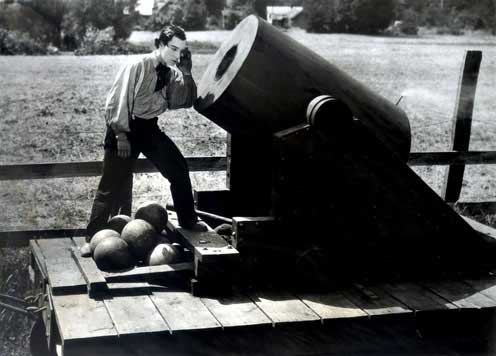 1926 saw the introduction of rear screen projection in Buster Keaton‘s The General (1926). Rear screen projection is mainly used to show the outside world moving fast while the actor sits in a motionless vehicle. This special effect requires a pre-recorded background plate to be projected onto a screen and then filmed again with the actor performing in front of it.