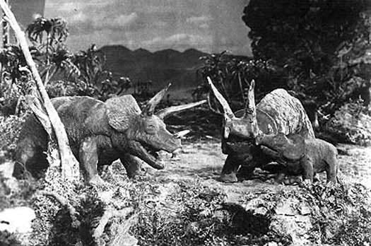 Speaking of plateaus, The Lost World (1925) introduced the world to the process of stop-motion animation and the remarkable work of artist Willis O’Brien. The Lost World is a direct ancestor of Jurassic Park (1993) and follows the story of Professor Challenger who sets out to prove that dinosaurs actually survived extinction and were living on an inaccessible plateau. It also features the famous Tyrannosaurus Rex/Triceratops fight that has since been referenced in countless films. For those of you too young to remember, stop-motion animation is a process whereby a metal skeleton encased in rubber (in this case a dinosaur) is created and then photographed one frame at a time with small adjustments made to the model between each frame to simulate movement.