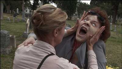 The DVD I’m reviewing is the 3D one, though I chose the 2D version to watch to keep my headaches at bay. Now is this a sequel or remake? Not quite. The main character Brianna Brown is called Barbara (Barb for short) though after the opening graveyard visit it pretty much is a re-envision from there. In fact I wasn’t sure if it was more a revisioning or a homage to the original. You’ll get the humor when she runs into a nearby house for shelter and the pot smoking family inside is sitting around watching the original on TV. When she exclaims that “zombies are coming”, its also hard for them to take her serious at least at first. Sid Haig plays a lead in this film as well as the bubbly, zany Gerald Tovar, Jr….who is a local mortician and funeral home owner that the zombies seem to have emerged from as ground zero. His choice of weapon? a shovel and some tasty backtalk.