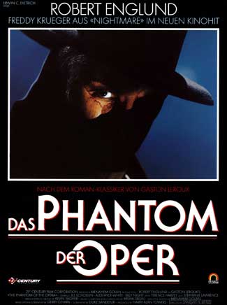A newer, gorier version of the classic 1910 Gaston Leroux tale has A Nightmare on Elm Street’s Robert Englund playing the Phantom. Christine Daaé is a young Broadway singer in New York City. She is auditioning for a show, and comes across an old piece of music written nearly 100 years before by an unknown musician name Erik Destler. Destler it seems had made a pact with the devil (maybe by accident) so the world would love his music, the catch was Erik’s face would be left horribly disfigured forever. Once Christine sings his music for an audition, she is hit with a sandbag, thus follows a presumed flashback into the past roughly around 1881, where she was the star in the London Opera House. There she is coached by a mysterious “Phantom” who will do anything to make his protege a star, even if it means murder. Christine soon finds out that her teacher is in fact Destler, whom she comes to loathe.