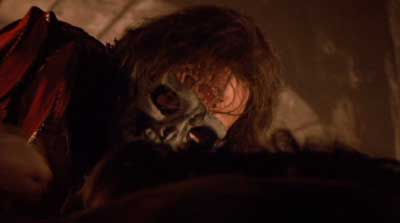 The enamored Phantom eliminates all those who would stand in the way Christine’s musical success, including killing the man who dropped the sandbag on her and hanging his skinned body in the closet of the diva of the evening whom Christine was the acting understudy giving her such a scare she could not perform . Most of the movie focuses on the characterization of Englund’s phantom, being the obvious box office draw to horror fans. The Phantom marauds through the film taking many lives and really ups the body count. Scotland Yard’s Inspector Hawkins (Terence Harvey) begins tying the deaths together to Christine and warns Christine’s love interest, Richard (Bill Nighy), about his and Christine’s impending danger in the face of the Phantom of the Opera.