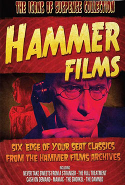 If your like me, you may have found yourself growing up on Hammer films whether thru late night showings or Sat after noon horror hosted runs. The Icons of suspense collects 6 black and white releases under one tidy roof. The films are listed as such: Stop Me Before I Kill (a/k/a The Full Treatment, 1960), Cash on Demand (1961), Never Take Candy from a Stranger (a/k/a Never Take Sweets from a Stranger, 1960 , These Are the Damned (a/k/a The Damned, 1963), Maniac” (1963)and “the Snorkel”.