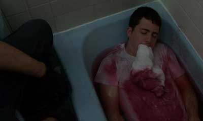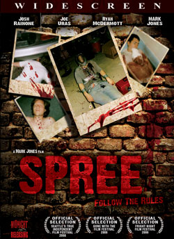 “Spree” begins with quick scenes that introduce the main players in the game. Alex(Josh Rainone) is busting out of a school building in an argument with his boyfriend, who had just cheated on him. Damien(Mark Jones) works at his dead end job, and spontaneously up and leaves his job. Wes(Joe Uras) sits in his apartment, drinking a beer. Lastly, Kevin(Ryan McDermott) lashes out in outrage when he finds out that his application to finally graduate had been denied. The four friends meet up, and discuss what has been bothering during the day.