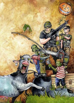 Evolution is the word best used to describe what I notice here compared to The Grimm: The Devil Birds of Carencro Isle & Garlu. With this issue I really see a more stylized approach to the overall look of the book. First of all is the Amazing cover. That cow scares me. The interiors have a flatter look to them, but it works better overall. It gives the book a more cohesive feel, compared to the art and story competing for attention, here they in harmony.