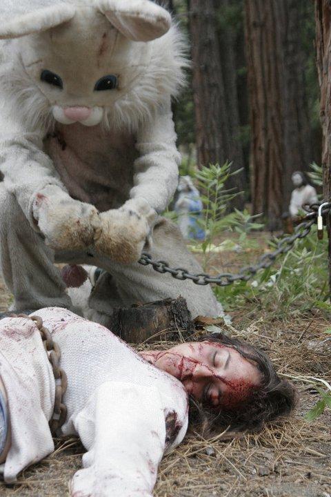 In 1974, director Tobe Hooper unleashed a film upon the world that would change the face of horror forever. Thirty seven years later, young filmmakers are still inspired by this film. There have been great films like Xavier Gans’ “Frontiers”, the mediocre (I know I may take some heat for this but..) “House of 1000 Corpses” (though I thought “The Devil’s Rejects” was a PERFECT movie), and the horrible “Texas Chainsaw Massacre” 2003 remake. When I sat down to watch “Bunnyman”, it’s apparent from the films’ opening scenes that this was another “TCM” clone. The opening scene felt much like the final scene in the original “TCM”. Does that make it a bad film? Did I dislike it? No, not at all. In fact, “Bunnyman” is an incredibly well-made homage with a killer that made me laugh a bit one moment, then be totally creepy the next. Director Carl Lindbergh crafts an entertaining tale that doesn’t skimp on the red stuff and manages to entertain throughout.