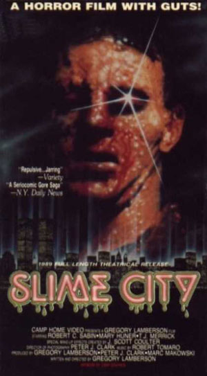 Slime City has developed a real cult following. A week doesn’t go by when someone doesn’t e-mail me about it. It’s a flawed film, to be sure – I was 21 when I directed it! – but we must have done something right, because a lot of horror fans are fond of it. It continues to be discovered. It played as a midnight movie in NYC in 1988, and was released on VHS in ’89, re-released in ’99, and then released on DVD in 2005, which is really when new fans discovered it. And now it’s being re-released this July as Greg Lamberson’s Slime City Grindhouse Collection, with my other two features, Undying Love (first time on DVD) and Naked Fear, as well as the Johnny Gruesome short and a bunch of documentaries. So I’m very pleased that even though I haven’t had a successful filmmaking career, there are people out there who respond to my work.