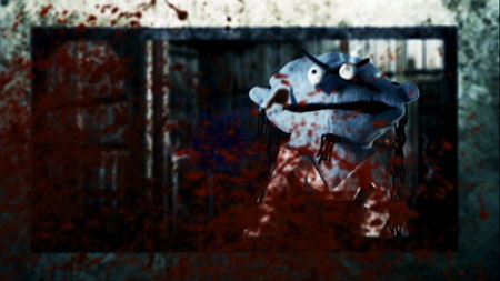 DWM: I just really wanted to do something crazy & original, that’s where the puppet idea came in. The closest thing we’ve ever had to a puppet horror film was “Meet The Feebles” I guess & that’s not even a horror film, it’s more of a exploitation film. That’s where the idea for using puppets came from. And I could also accomplish things on a very low budget using the puppets and still have it be convincing and coherent that I couldn’t do with live actors. Like some of the backgrounds & effects for instance, I could make the backgrounds sort of cartoony looking because the puppets are cartoony looking as well. I wanted to tell a big story and I think it would have been hard for me to do it with live actors. Plus, at this budget level where you can’t afford to pay people I didn’t have to worry about disgruntled actors. Puppets are always on set on time & they don’t complain! And they do a perfect take every time as long as I’m on point when I’m puppeteering them. So it just made things go a lot smoother. I think a lot of low budget/no budget filmmakers would agree that when you’re not paying your actors it’s hard to depend on them. And that’s not their fault, it’s just the way it is. But with puppets I didn’t have to worry about that. When we filmed It was just me & my assistant director most of the time in the living room with a green screen and a camera.
