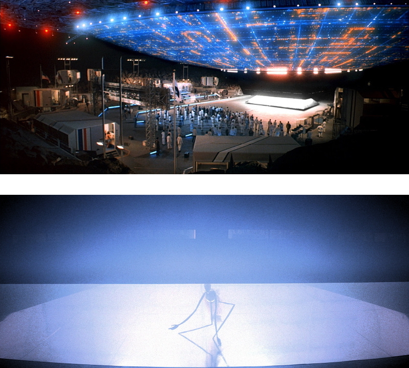 This vision is shared by other residents of Indiana who have also seen the lights of the UFO, and Jillian is convinced that her son has been kidnapped by the flying saucers. From then on the film concerns their attempts to discover what the mountain-like shape represents, and this is inter-cut with a subplot concerning a mysterious group of scientific and military experts, headed by Frenchman Claude Lacombe (François Truffaut) and his translator (Bob Balaban), who are traveling the world trying to decipher and interpret the musical signals and lights that have been recorded emanating from various UFOs. This middle part is perhaps the weakest part of the film, as Speilberg was obliged to pad it out with a number of extraneous sequences and subplots. The film’s final forty minutes are the important ones. Roy, Jillian and the others converge with Lacombe’s team at a mountain called Devil’s Tower in Wyoming, which turns out to be the mysterious mountain in the vision. They all wait for the titular ‘encounter’, Lacombe and his men have brought along a Moog synthesiser and what looks like an up-ended disco dance floor with which they hope to communicate with the aliens. They are not disappointed. The UFOs, in the form of a dazzling display of lights, appear on cue and there follows a barrage of spectacular visuals accompanied by bursts of electronica, which culminates in the landing of the vast alien mothership, a circular object with cathedral-like spires rising from its centre and covered with hundred of illuminated windows. Then the aliens appear – first a swarm of child-like aliens, glowing and indistinct like humanoid fireflies, followed by the chief alien whom we see in close-up – an ethereal and apparently androgynous figure with a long neck and no hair. As he stands there, Lacombe steps forward and smiles and, after a pause, the alien smiles back.