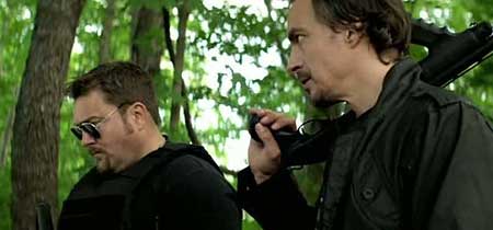 At the time of reviewing this, I was feeling pretty tired, so my attention span was on the verge of being lost. Though a good sign usually in my case is when I am engaged enough in the film that anything else takes a a back seat. Battleground was a case that I quickly perked up to a decent storyline and an action filled premise egging me on. The premise does feel derivative until the psycho on the woods adds some flair to the storyline. I was reminded though of the film “Wrong Turn 3” (I believe that was the one) that carried itself along similar lines. Though in “that” case, it was more typical of “crazy rednecks in the woods”
