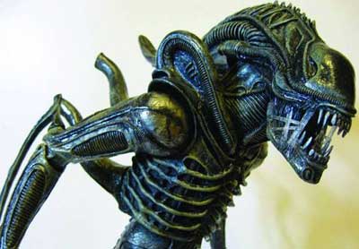 in ‘Aliens’ 1986 the creature has fangs and then some. It has an inner retractable jaw with a small row of fangs that is more like a scissor than anything but with the power to take a quick chuck out of a victim so the real jaws can start their work. The Alien holds its victim about arms reach away, the smaller scissor jaw then makes a quick powerful bite that puts its victim into shock, thus letting the helpless victim be darn in closer to be eaten with no risk to the Alien. Frankly I think the sight of this horror would have most humans cowering to the floor in terror. But then again this creature travels the galaxy looking for its next meal.