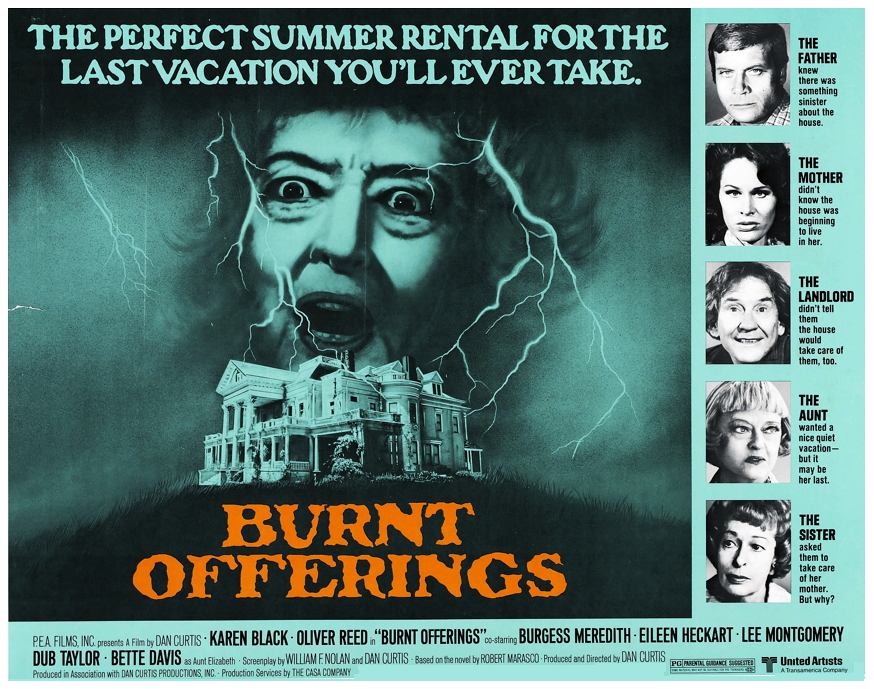 One of the oldest possession themes of all is the house or building possessed of evil, from The Turn Of The Screw by Henry James (1898) to The Haunting Of Hill House by Shirley Jackson (1959) to The Shining by Stephen King (1977). In fact the ‘Evil House’ has become so universal it was the subject of The Simpsons first segment of their very first Treehouse Of Horror episode, entitled Bad Dream House. In Burnt Offerings (1976) a mansion near the sea is rented for the summer by Marian and Ben Rolf (Karen Black and my old drinking buddy Oliver Reed) with their son Davey (Lee Montgomery) and old aunty Elizabeth (Bette Davis). Locked away upstairs is the landlord’s unseen invalid mother, whose meals are left for her on a tray.