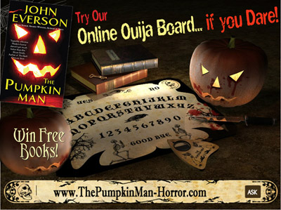 Editor’s note: Go to the new site for The Pumpkin Man: http://www.thepumpkinman-horror.com and ask the online Ouija Board your darkest questions! And then enter the Contest to win free autographed John Everson books or e-books, as well as autographed CDs from the band New Years Day. Make sure you note that you are entering the contest from Horrornews.net whn you enter the contest — someone from Horrornews.net will win an e-book edition of The Pumpkin Man, and everyone will be added to the Grand Prize contest!