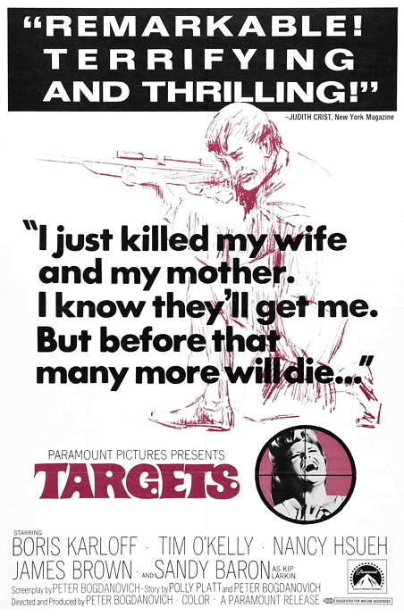 Targets has two seemingly unrelated story-lines that come together at the climax: While horror movie veteran Byron Orlok (Boris Karloff) prepares to make a personal appearance at a drive-in screening his latest film, Bobby Thompson Junior (Tim O’Kelly), an amateur gun enthusiast, goes crazy-ape-bonkers and shoots wife and mother, then shoots random highway motorists while hiding in a water tower with his cache of weapons, and ends up behind the screen of the drive-in showing Orlok’s film, shooting people as they sit in their cars.