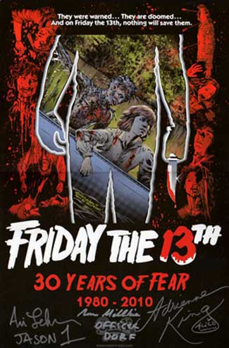 August is the month for Friday the 13th!So if you’re looking to find that perfect gift for the greedy fanboy in you I have just the thing, the Friday The 13th 30 Years of Fear T-shirt and poster set! The set comes with a limited edition commemorative T-shirt and poster featuring deliciously wicked artwork by Fright Rags superartiste’,Jeff Zornow. Tshirts will never be reprinted or resold, once they are gone, they are gone quicker than the pulse of one of Mrs. Voorhees’s victims. The poster of the artwork is suitable for framing, and as an added bonus, each poster will be hand signed and numbered by the stars of Friday; Ari Lehman,and of course, my supersweet friend, Adrienne King.If that wasn’t enough, randomly inserted into select packages will be lobby stills, publicity stills, or even a press kit!Certain pieces will be autographed by the stars once again including:Kevin Bacon(man, that’s a keeper), Betsy Palmer,and Adrienne once again.Look for the link to purchase this killer set on ADRIENNEKING.COM!