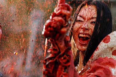 Sushi Typhoon continues in the tradition of exciting over the top Tokyo films with this latest great blood fest titled “HellDriver”. Now those in the know have been hearing about this one under production for quite some time…I’m hear to say it doesn’t disappoint. Under the much heralded command of FX wizard Yoshihiro Nishimura “HellDriver” takes on a future-fiction existence that occurs when a sister and brother murder team is hit directly with an outer space meteor. In the heart of killing off the father of Kika (Yumiko Hara), a young school girl,….the 2 have just finished eating parts of him only to find that an outer space force has plummeted to earth to start a chain reaction of chaos. Rikka (Eihi Shiina) at the core of it.