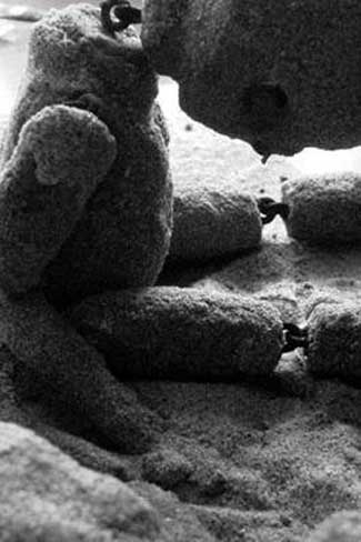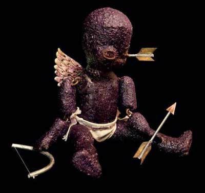 Another of my personal favorites are the sweetly unsettling Sandbaby Castaways by Glenda Rolle . These little darlings make me want to pick them up and nurture them back to sanity, or lock them in an iron box and lose the key. Their jointed, sandy bodies have the skin crawling look of some scratchy Quay Brothers concoction and each with their single blinky eye makes you feel as if they are seeing things about you that you wouldn’t want anyone to know, much less a disturbingly adorable dolly. The Sandbaby’s feature in the hauntingly lovely book “Upon Water’s Edge” available from the artist’s website. Glenda’s Sandbaby’s have an equally creepy family – including the spike headed Pesticide Doll and the unfortunately pierced Clumsy Cupid. I very much like Glenda’s ability to simultaneously tap into my “aww that’s cute” and “run away screaming!” aesthetics.