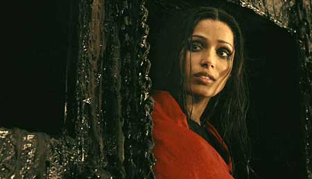 Along the way, Theseus picks up a couple of partners to help him in his quest, Stavros (Stephen Dorff) & Phaedra (Freida Pinto). Stavros is a small man but a ferocious fighter & Phaedra is an Oracle who has told Theseus that he will be a key component in the battle between Hyperion & the gods. But nothing can happen until the famed bow can be recovered. Much like “The Sword In The Stone”, it’s imbedded in a large boulder & only Theseus can pull it out (A pretty good scene save for the fact that the boulder comes apart way too cleanly to look realistic). Once Theseus has the bow the real battle begins. If you’ve seen the trailers for the film you already know that the bow is seemingly made of light & can fire multiple glowing arrows at one time. and it never misses it’s target(s). It’s exciting to see the bow come into play whenever Theseus uses it as it’s a pretty cool special effect & it produces some spectacular deaths.