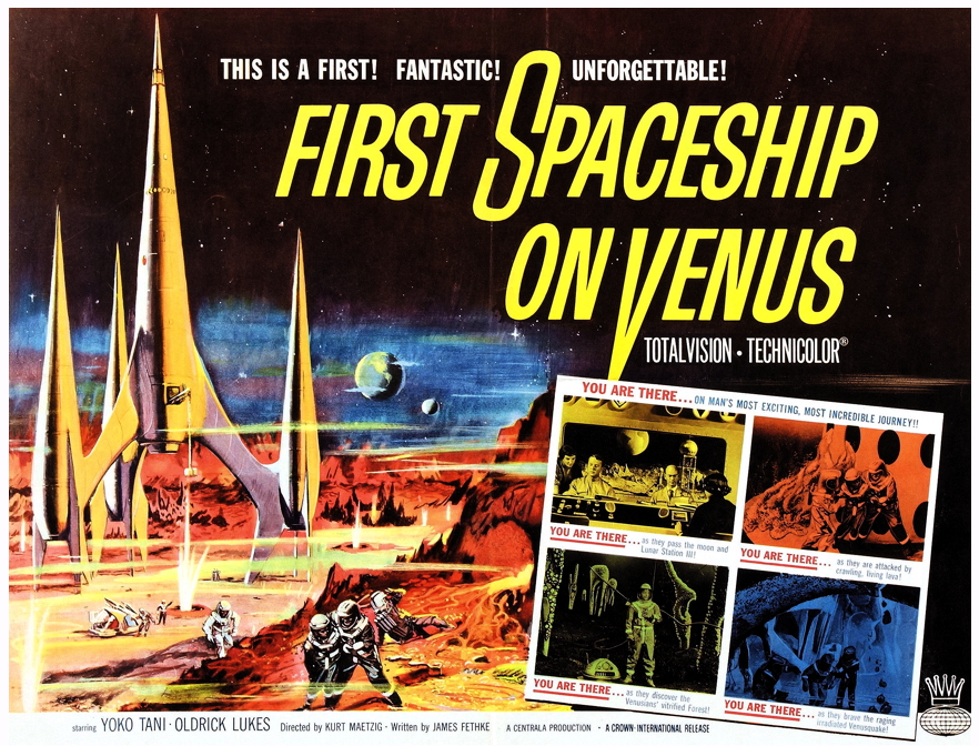 Are you back yet? I found out that First Spaceship On Venus is actually a Soviet-financed film with an anti-nuclear message. You see, back in the fifties the USA became obsessed with enormous rockets penetrating deep space, evidenced by the large number of films made during that time. Strangely enough, America seemed to be the only country making these kinds of films. Japan was busy with giant monster smackdowns, Italy had its hands and feet full with swords and sandals, Mexico had its mind set on crime-fighting wrestlers and, with typical efficiency, Germany didn’t even bother with the metaphors and went with smut. But the USA wasn’t alone in the creation of such films. In fact, their rival in the Space Race, Russia, was also making major space movies, and if these films were anything to go by, Soviet space missions were just as wacky as their American counterparts. Ponderous and introverted, yes, but still wacky.