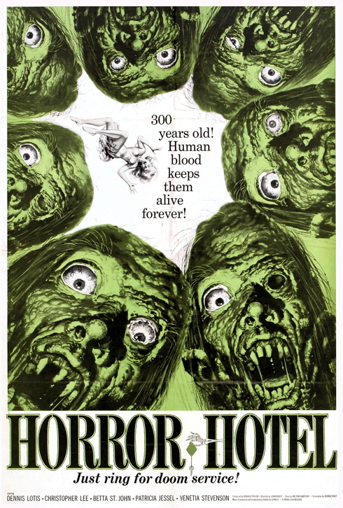 This week’s trouser-filler is the British tourist trap known as Horror Hotel (1960) starring two of the tallest baritones I’ve ever met, Christopher Lee and Valentine Dyall. Horror Hotel was made at Shepperton Studios which, more than a decade later, would squeeze out the cult classic The Wicker Man (1973) which also starred Mr. Lee in a somewhat similar baritone. Although made in England, the story is set in the USA, and you can sometimes hear the actors slip in and out of their accents. It’s easy to make fun of its clichés, but the truth is Horror Hotel created many clichés that were later done to death and, at its best, contains some genuinely creepy scenes and a plot twist or two.