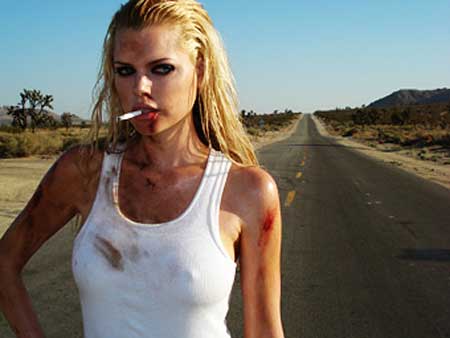Oh wait…I’m a reviewer, so I get to question all I want while I smite and strike down MY enemies in the name of the beast they call The Desolate One – the greatest unholy savior on the World Wide Web, The Almighty Horrornews!!! And question, I shall. And the enemy I’m smiting here? Easy…taking a premise that had the balls to be original and the promise of being entertaining and so kickass that I couldn’t wait for it to finally get going that…wait…I spent the next 80 or so minutes actually waiting for it to get going and instead watched it turn into very, very, very, very low-rent LEGION as the two girls waited out the sunlight in a roadside truck stop while Brooke tried half-heartedly to control her cravings while Rhea tried half-heartedly to control Brooke. Okay, if they’re immortal saviors for God against evil, why does sunlight bother them, vamps or not? Can’t they hunt during the day too, or does pure evil, just like the freaks, only come out at night what, what, what??