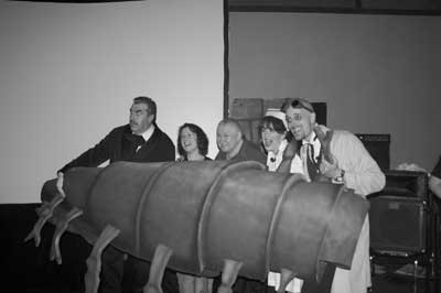 LU: We had talked several times about my plans for the show and he knew all about it. One thing I had wanted to do was rig the first row of seats to vibrate like William Castle did, but we never came up with a cheap enough way to do it. I almost went and bought a bunch of little vibrators from an adult store and wired them to the bottom of the metal chairs! That would have really been a story to tell!! But we decided to scrap that idea due to cost, and I spent the money instead on building the giant tingler. Bob saw the beast for the first time about an hour before the show. John Goodwin, the CSI makeup artist, played my associate Dr. Princent Vice in the show. He made an incredibly gruesome looking scar that was sewn up with shoestrings, and he pre-attached it to Bob’s back before the show. That way we could show the audience our handiwork post-operation. Great stuff!