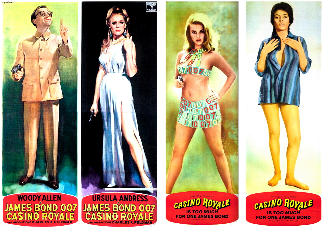“Sir James Bond is enjoying his retirement when four international agents press him into service again in hopes of smashing SMERSH and topple Le Chiffre at the baccarat tables. Bond is taken in by Agent Mimi (alias Lady Fiona McTarry) who immediately falls in love with him. Bond’s illegitimate daughter, Mata Bond, whose mother was the late Mata Hari, is going to help out. The current agent using the Bond name, Cooper, has his hands full, despite his assistance by beautiful secretary, Moneypenny. 007’s nephew Jimmy Bond is supposedly incompetent. Bond, hoping to clear his name from its current low repute, hires Evelyn Tremble to meet Le Chiffre at the gambling tables at Casino Royale. The world’s richest agent, Vesper Lynd, helps convince Tremble to masquerade as 007.”