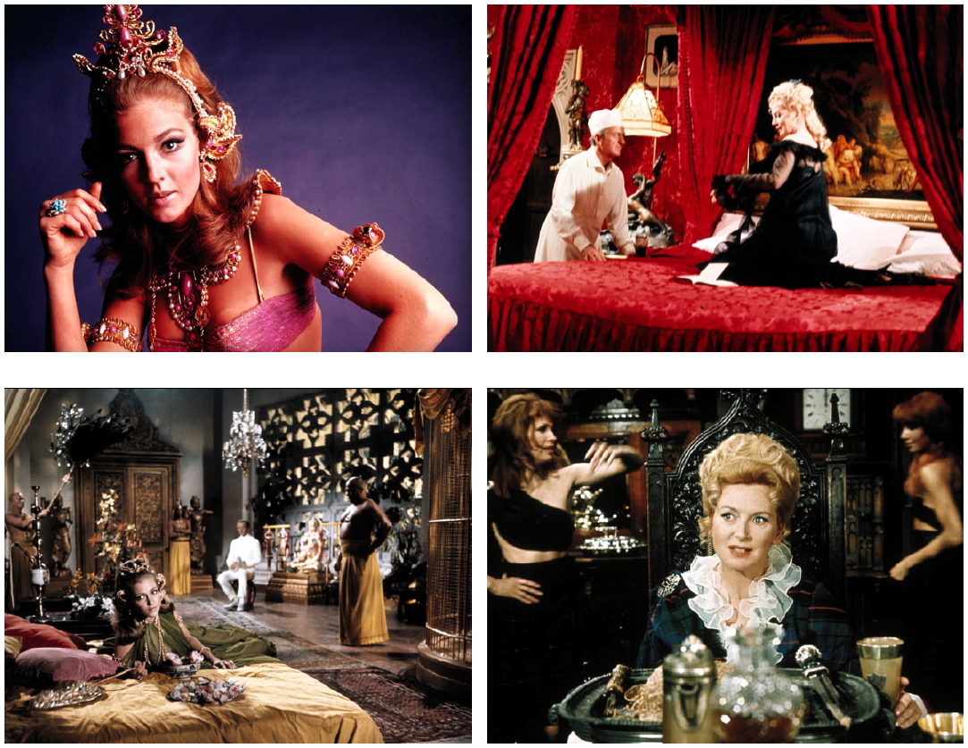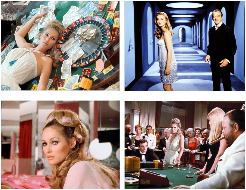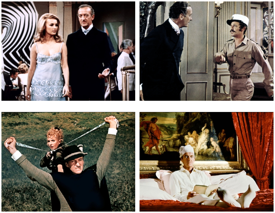 Since Charles Feldman was unable to use Sean Connery in his version, he decided the only possible solution was to send-up the James Bond persona, making Casino Royale a kind of farcical satire with only a very marginal connection to the original novel. Despite having ten writers (including Terry Southern, Woody Allen, Wolf Mankowitz, Ben Hecht and Joseph Heller), five directors and a dream cast that included Peter Sellers, David Niven, Ursula Andress, Orson Welles, Joanna Pettet, Deborah Kerr, Woody Allen, William Holden, Charles Boyer, John Huston, Barbara Bouchet, George Raft, Jean-Paul Belmondo, Peter O’Toole, Sterling Moss, Terrence Cooper, Bernard Cribbins, Ronnie Corbett, Kurt Kaszner, Anna Quayle, Geoffrey Bayldon, John Wells, Derek Nimmo, Geraldine Chaplin, Valentine Dyall, Anjelica Huston, Burt Kwouk, John Le Mesurier, Caroline Munro, David Prowse, Jacqueline Bisset, Alexandra Bastedo and John Bluthal, the movie is a confused concoction in which the secret services of Britain, America, France and Russia meet to discuss how the evil organisation SMERSH can be foiled.