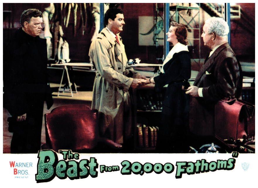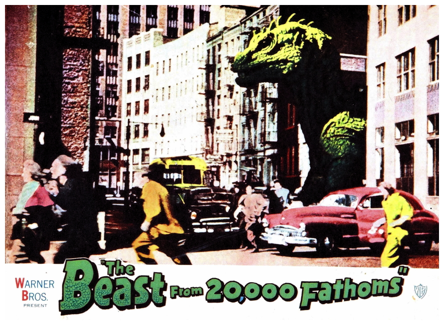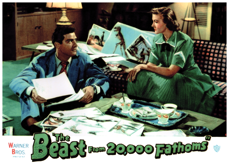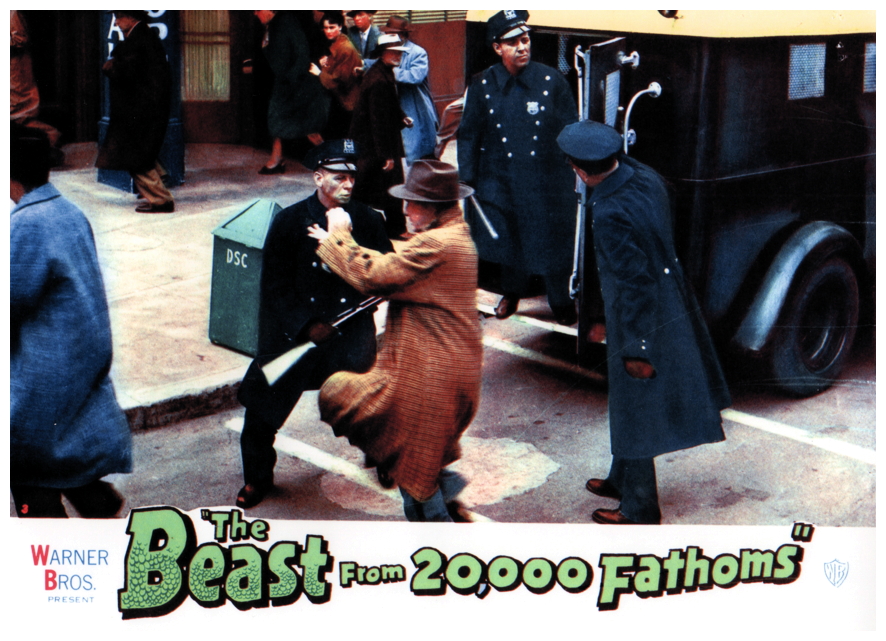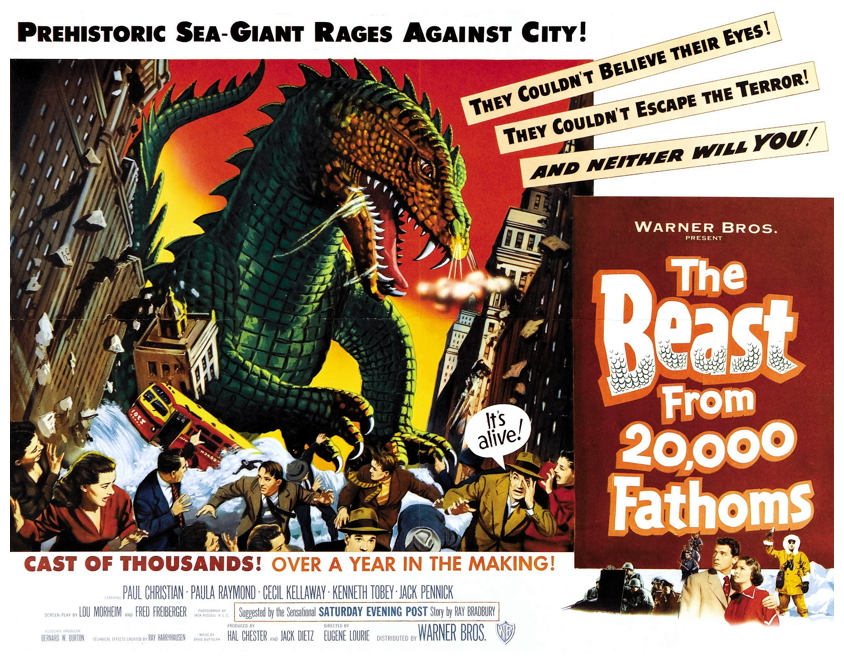 “As a result of an arctic nuclear test, a carnivorous dinosaur thaws out and starts making its way down the east coast of North America. Professor Tom Nesbitt, only witness to the beast’s existence, is not believed, even when he identifies it as a ‘rhedosaurus’ to paleontologist Thurgood Elson. All doubts disappear, however, when Elson is swallowed whole during an oceanic bathysphere excursion to search for the creature. Soon thereafter the rhedosaurus emerges from the sea and lays waste to Manhattan Island until Nesbitt comes up with a plan to try to stop the seemingly indestructible beast.” (courtesy IMDB)