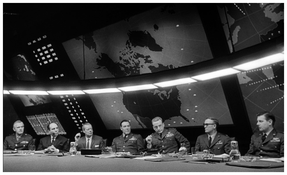 “Paranoid Brigadier General Jack D. Ripper of Burpelson Air Force Base, he believing that fluoridation of the American water supply is a Soviet plot to poison the U.S. populace, is able to deploy through a back door mechanism a nuclear attack on the Soviet Union without the knowledge of his superiors, including the Chair of the Joint Chiefs of Staff, General Buck Turgidson, and President Merkin Muffley. Only Ripper knows the code to recall the B-52 bombers and he has shut down communication in and out of Burpelson as a measure to protect this attack. Ripper’s executive officer, RAF Group Captain Lionel Mandrake (on exchange from Britain), who is being held at Burpelson by Ripper, believes he knows the recall codes if he can only get a message to the outside world. Meanwhile at the Pentagon War Room, key persons including Muffley, Turgidson and nuclear scientist and adviser, a former Nazi named Dr. Strangelove, are discussing measures to stop the attack or mitigate its blow-up into an all out nuclear war with the Soviets. Against Turgidson’s wishes, Muffley brings Soviet Ambassador Alexi de Sadesky into the War Room, and get his boss, Soviet Premier Dimitri Kisov, on the hot line to inform him of what’s going on. The Americans in the War Room are dismayed to learn that the Soviets have a yet as unannounced Doomsday Device to detonate if any of their key targets are hit. As Ripper, Mandrake and those in the War Room try and work the situation to their end goal, Major T.J. ‘King’ Kong, one of the B-52 bomber pilots, is working on his own agenda of deploying his bomb where ever he can on enemy soil if he can’t make it to his intended target.” (courtesy IMDB)