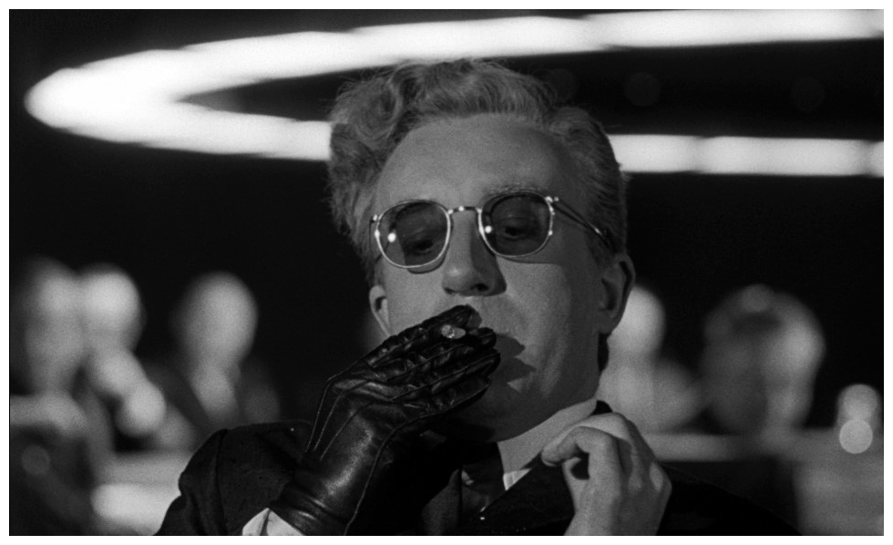 But the most audacious stroke of all is undoubtedly Dr. Strangelove himself. Only near the very end of the movie (and the world) are we allowed to see him properly, with his crinkled wavy coiffure and maniacally glinting eyes, like some sort of exclusively nocturnal creature that thrives on reveries of apocalypse. His artificial metal arm jerks involuntarily into ill-timed Nazi salutes, or clamps itself firmly around his own throat. He revels with guttural gusto at the prospect of spending his post-nuclear existence surrounded by a harem of generously endowed young women, all conscientiously propagating the species. And his apotheosis – rising triumphantly from his wheelchair with the demented cry, “Mein führer! I can walk!” – coincides with the final catastrophe. Strangelove may be a caricature, but a caricature of pure genius.
