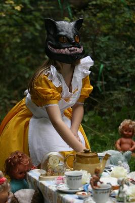 The first thing that catches you when watching “Red Kingdom Rising” is that much of the story is told visually. The film (and when I say FILM I mean film, a low budget effort shot on actual super 16mm) uses very little dialogue during the first half of the narrative and we revisit Mary Ann’s life just as she does. Many of the scenes were directly inspired by many of the images we associate with “Alice in Wonderland”. One such instance is when she meets a young girl in the woods named Alice, sitting on a tree branch and wearing a cat mask. What does that sound like? That is only one example and there are others, but that isn’t all there is to the film.