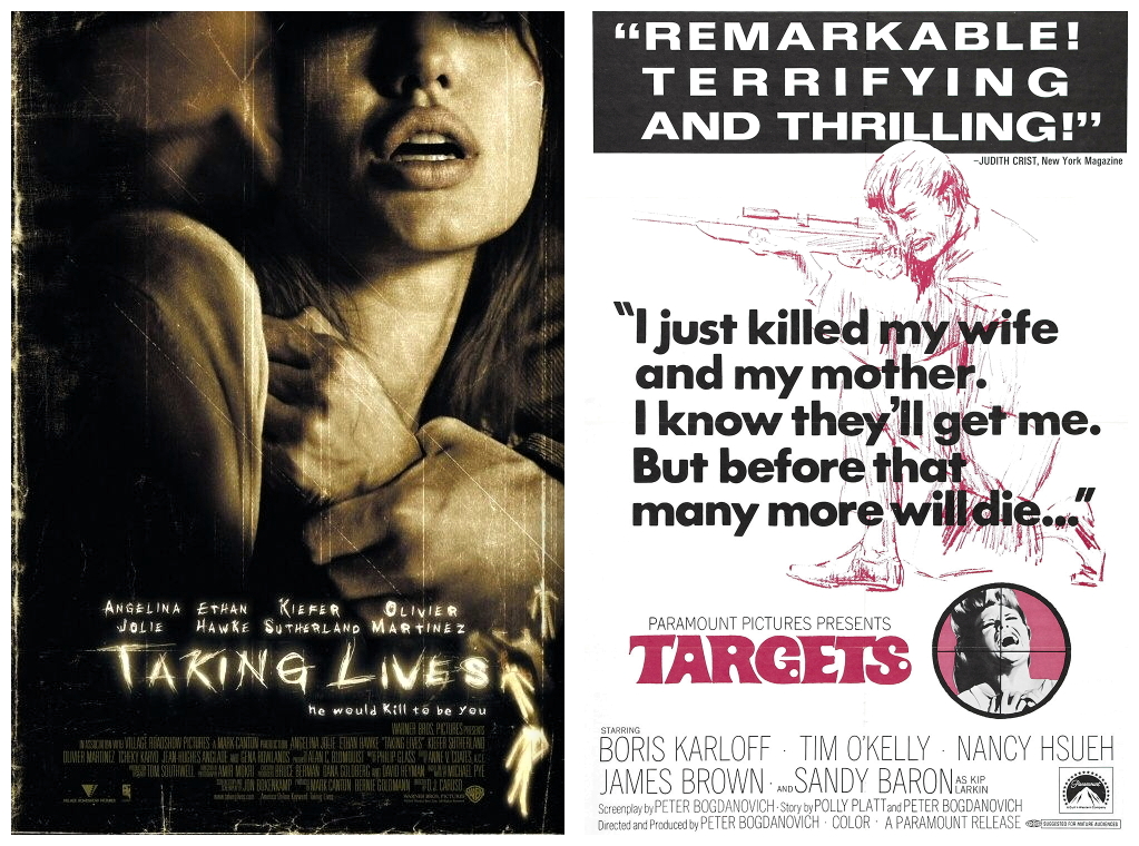 TARGETS (1968), filmmaker Peter Bogdanovich’s debut feature film, is a thinly disguised account of ex-marine Charles Whitman who, after murdering his mother and his wife, armed himself with a number of rifles and handguns and, on a sunny 1966 Texas morning, shot dead fourteen more people and wounded thirty-two people. Bogdanovich’s version tells two stories concurrently, about an aging horror-film star (Boris Karloff) who feels that his type of movie monster has become passé, and the other about a father-hating gun freak (Tim O’Kelly) who goes on a rampage to get even with his dad by shooting at people from the top of a water tower and then from behind a drive-in movie screen.