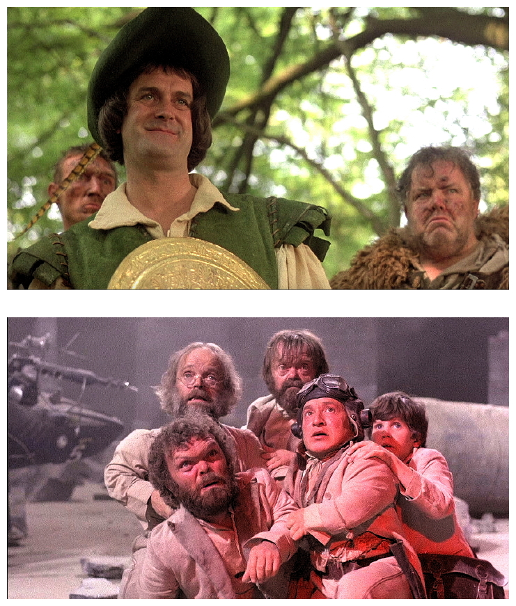 The team consisted of writer-performers Graham Chapman, John Cleese, Eric Idle, Terry Jones and Michael Palin, and also Terry Gilliam who produced the darkly comic animated cartoons and links, which often consisted of such cosmic injustices as huge feet appearing from the sky to squash people, or giant monster cats devouring London. When the series ended, the group reassembled from time-to-time to make movies. And Now For Something Completely Different (1971) was merely a rehash of their television sketches for the American market. The first original film was Monty Python And The Holy Grail (1974), followed by Monty Python’s Life Of Brian (1979) and Monty Python’s The Meaning Of Life (1983). Jabberwocky (1977) and Time Bandits (1981) were primarily the creation of Terry Gilliam with the help of Michael Palin and other members of the Python team, but they are so much imbued with the Python spirit that they deserve to be considered part of the Python oeuvre.