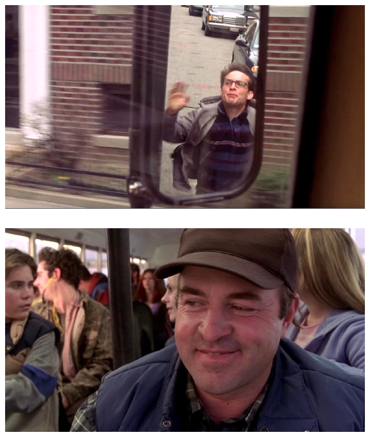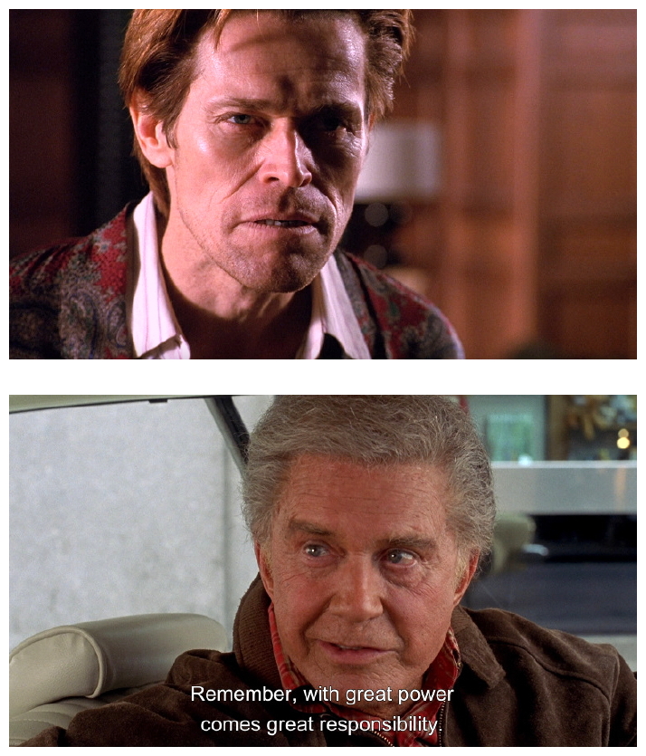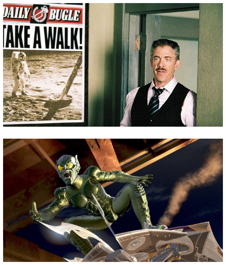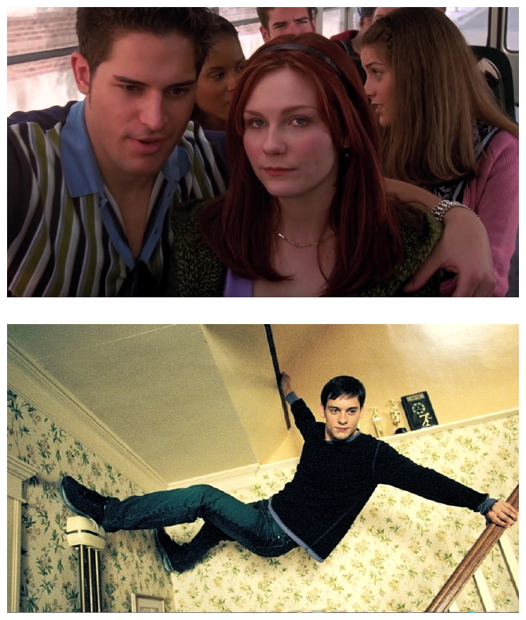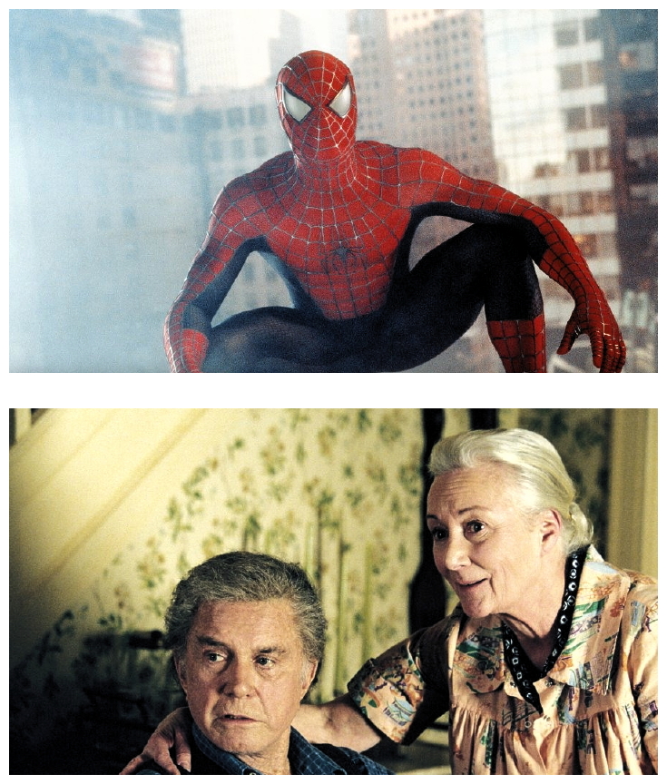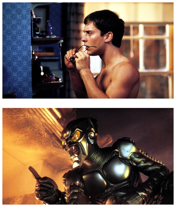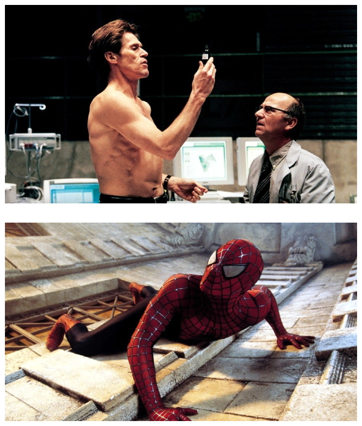 In Spider-Man (2002), Peter Parker (Tobey Maguire) is a dorky but sweet-natured teenager living in a modest house in Queens with his Uncle Ben (Cliff Robertson) and Aunt May (Rosemary Harris). Parker pines in vain for the girl next door – the blazingly red-headed Mary Jane Watson (Kirsten Dunst) but she’s already hooked up with his best friend – the dull but spectacularly wealthy Harry Osborn (James Franco). On a school science trip, Parker is bitten by a genetically modified spider and, after a nauseous night, Parker wakes to find he’s acquired some serious spider qualities: Agility; strength; the ability to shoot sticky web goop from his wrists; and fingers sticky enough to scale walls. Meanwhile, under pressure from financiers to perfect his ongoing genetic experiments, Harry’s father – millionaire scientist Norman Osborn (Willem Dafoe) – has unwittingly transformed himself into the Green Goblin, a power-crazed lunatic clad in a shiny metallic suit, his face hidden behind a gargoyle mask frozen in a permanent cackle.