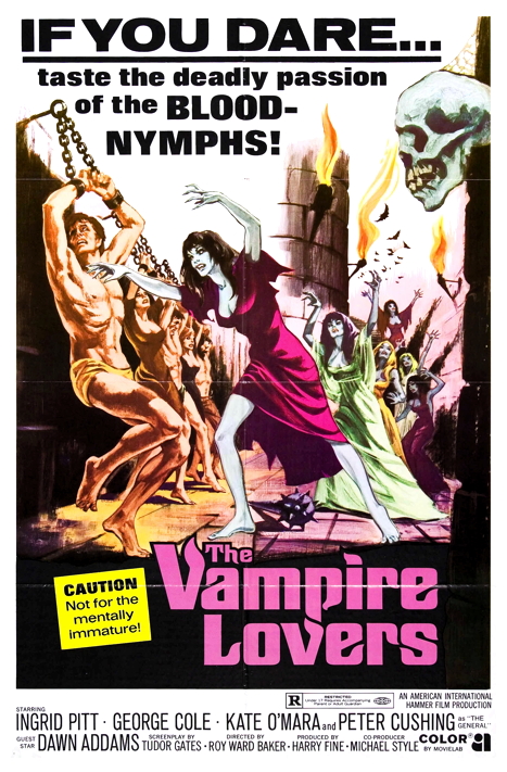 THE VAMPIRE LOVERS (1970): Sheridan Le Fanu‘s novel Carmilla gets the Hammer Horror treatment with Ingrid Pitt and Kate O’Mara directing the sappho traffic before being beheaded by a bemused Peter Cushing. Directed by Roy Ward Baker and also starring Madeline Smith and Jon Finch, the film is the first part of the so-called Karnstein Trilogy, followed by Lust For A Vampire (1971) and Twins Of Evil (1971). The three films were somewhat daring for the time in explicitly depicting lesbian vampire themes. In fact, before production began the script was sent to the censors, who warned the studio about depictions of lesbianism. Hammer Studios insisted that the lesbianism wasn’t their fault as it was actually present in the original story by Le Fanu. The censors backed down.