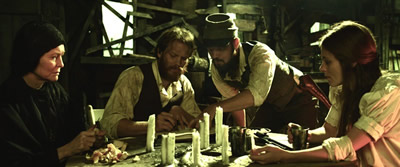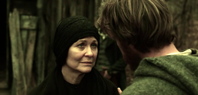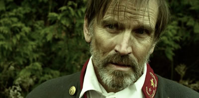 Mark Gibson stars as Edward Young and is a good “younger” version of Brian Cox’s narration. His voice and Cox’s voice mesh well. Gibson handles the material well as he pantomimes his way through the beginning and later interacts with the other cast. He brings the right amount of intensity the role, a driven focus. He’s an interesting protagonist. The rest of cast fares equally as well with each of the main supporting characters well cast. Dee Wallace (E.T., Cujo, The Howling) appears as Eve, a fortune teller who is suspect of being a witch and may hold the keys to surviving the apocalypse. It’s a smaller supporting role, but an important one that her talent and familiar face elevate the role quite a bit. Stephen McHattie (Pontypool, Watchmen, The Tall Man) is a medic, serving under General Williams’ forces, but is given precious little to do missing out on much of the character and charisma the actor could potentially bring to the film. A great deal of energy is brought to Exit Humanity with the casting of genre favorite Bill Moseley as the evil, misguided General Williams. Where every other role is rather subdued and understated, Moseley still manages to instill much of his manic behavior to the role bringing a start contrast to the film. His General Williams stands out even when his character is standing completely still for a photograph. Even then, his energy is bouncing around him making his slightest expression a magnitude of madness. Having Moseley appear about the midway mark is a welcome relief and a clear sign things are going to liven up – which, of course, they most certainly do.