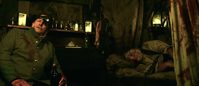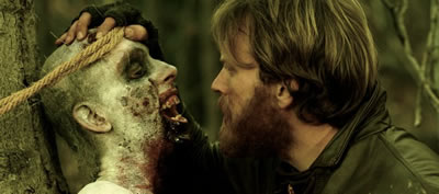 For the better part of the first half of the film, there is very little dialog, with Edward Young screaming in agony or despair more than having anything meaningful to say. Instead, the director uses voice over narration to express the character’s thoughts and motivations. The talented Brian Cox steps in to provide the narration and he brings a powerfully expressive voice and emotion to the film as a more mature version of Edward. Combined with the film’s strong diary approach, it immediate feels like an aged version of the character relating evens from his past. This imposes a number of effects on the film. For one, it brings a strong intimate ambiance to the story, a personal recounting of the events shared passionately with the audience. It also lets you know the protagonist is going to survive to tell the tale which undermines some key scenes where Edward Young’s life is threatened, either by zombies, General Williams or himself. Many times the narration is far more interesting than the visuals on screen, which causes the sluggish pace to crawl even slower. Later in the film, after more characters are introduced and a more natural dialog exchange is permitted, the balance between the film and the narration is stronger and the film become more engaging.