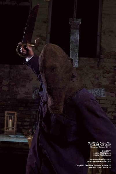 As much as I love horror films, my favorite films don’t exactly fall under that category. My all-time favorite film is the Russ Meyer classic, “Beyond the Valley of the Dolls”. I love films that center around rock bands in crazy situations. Another in my top ten is “Rock and Roll High School”. Whether they are real bands or fictional bands, I love how the music is as much a part of the story as the characters are. When it comes to rock and roll horror films, most of them are corny but “Trick or Treat” frakking rules!! The only other rock and roll horror film that comes close to being as much fun was “Suck”. So when I read the synopsis for the British horror film “Deadtime”, I felt a pang of excitement. A rock band is in a warehouse cutting a new video while everyone is being turned to mincemeat by a masked psycho. It could have been something great. In fact, there are a few moments of brilliance that shined through, but overall, it was a severe disappointment.