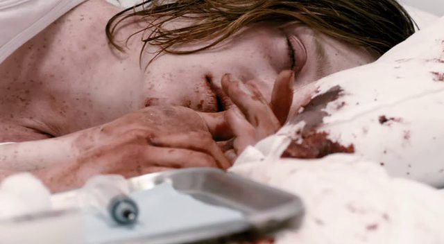 The effects in Antiviral call back to early films of Brandon’s elder, to many of his father’s films. The influence of David Cronenberg on his son is undeniable in the visual, visceral make-up of Antiviral, in an exciting and promising way. The affects of the viruses on Syd, Hannah and other characters is disturbing in its realism and implications. Shot against stark white backgrounds, the bright red blood is shocking and disturbing, with the film’s horror hidden just below its silky serous crimson surface. Syd’s hallucination mid-film, where his mouth transforms into a bleeding grate and his body is suspended by metal coils, is pure body horror originated by his father decades ago in films like Videodrome. Other scenes that explore a subplot about selling meat genetically manufactured from celebrity DNA is grotesque without being demented and vile. The hallucination aside, the effects in the film, no matter how far-fetched, are uncomfortably realistic and unsettling.