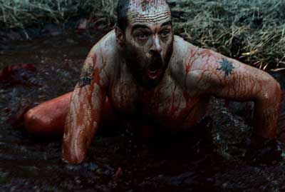 I must admit, with this one I was expecting the typical killer in the woods scenario we’ve seen 1000 times. As the film carried forward I began to realize that at last someone comes to the table with a slightly different take. Killer in the woods? Yep, but how we get there is so much more different. In simple form, “DeadFall” involves 3 guys who head out into the woods on a manhunt as I like to call it. Basically they are equipped with a flashlight, a few bottles of water, a trash bag and well …….a hunting knife. The challenge here is that they head out into nature without any provisions and must live off the land. This is by choice of course but it’s sort of a nature trend that keeps the hunters honest and bright in regards to survival skills. There’s a TV show that does this, but its not meant to be horror (Bear Grylls, I believe) In any case, 1 of them, John is a veteran. He knows all the tricks and has done this plenty of times. Julian is the protege and is 2nd on the list of survivalists. Then there is newbie Paul, who comes along reluctantly to the mission or to what Julian feels. Now with John on their team, it’s pretty certain that things will be ok. After all he’s somewhat of a nature master. He educates the 2 along the way and shows them the ropes. Yes, this even includes having to chew on plenty of nasty bugs for nourishment. Oh ya, pissing in a bottle for water sustenance is just one of those things I try and avoid.