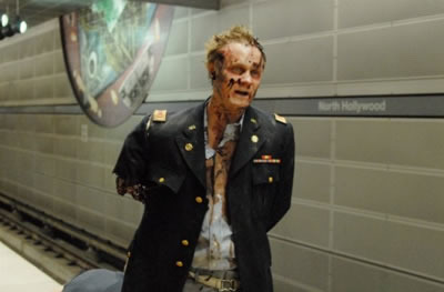 make-up then putting in the eyes was hell. Then people knew not to be around me for a minute or ten or twenty (laughs) then I’d be ready. Even though it was hell I was just ready to do it. A lot of the stuff, like the subway that was packed in and I only had one arm and shit. My character just goes to so many places in this movie that there were a lot of gems that were not fun to shoot but it served the character and the movie. Me being uncomfortable was kind of crucial I guess. If your pissed at the end of the day then use it.