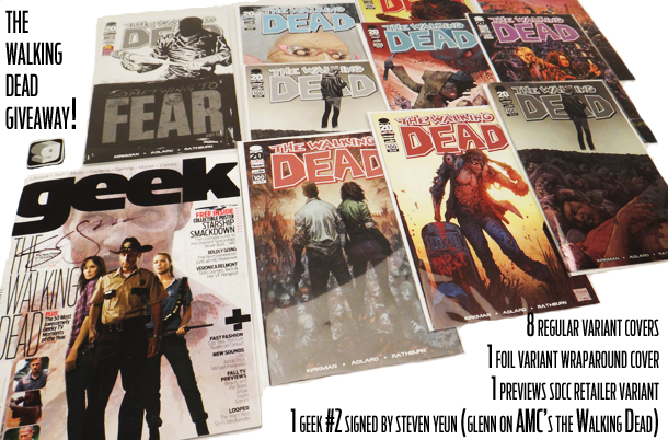 In honor of our 2nd issue cover, GEEK Magazine is giving away a set of 10 different The Walking Dead #100 comic cover variants. Even better, we’re throwing in a rare Geek magnet (woo!) and copy of Geek #2 signed by Steven Yeun, who plays Glenn on AMC’s the Walking Dead tv series!