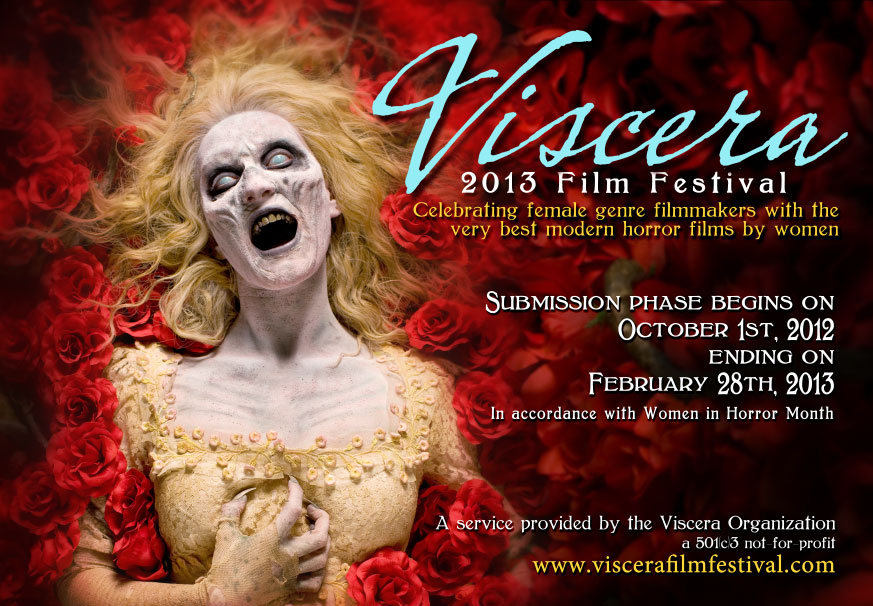 LOS ANGELES, CA, October 1, 2012 – Now that Halloween is drawing near, female filmmakers working in genre cinema are stampeding to Viscera as it announces its 2013 festival call for submissions. From October 1, 2012 through February 28, 2013 (culminating in Women in Horror Month), Viscera is accepting digital submissions for its 2013 festival season. Unlike most festivals, Viscera does not charge submission fees. Filmmakers interested in submitting should head to the Submissions tab of the main website, www.viscerafilmfestival.com