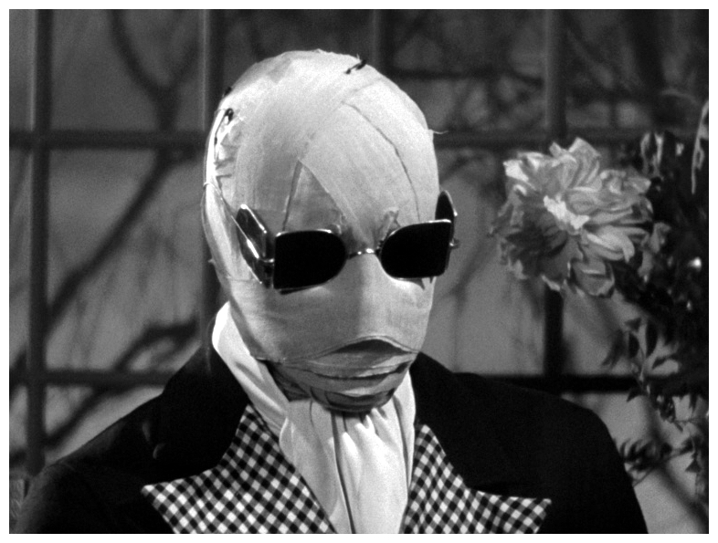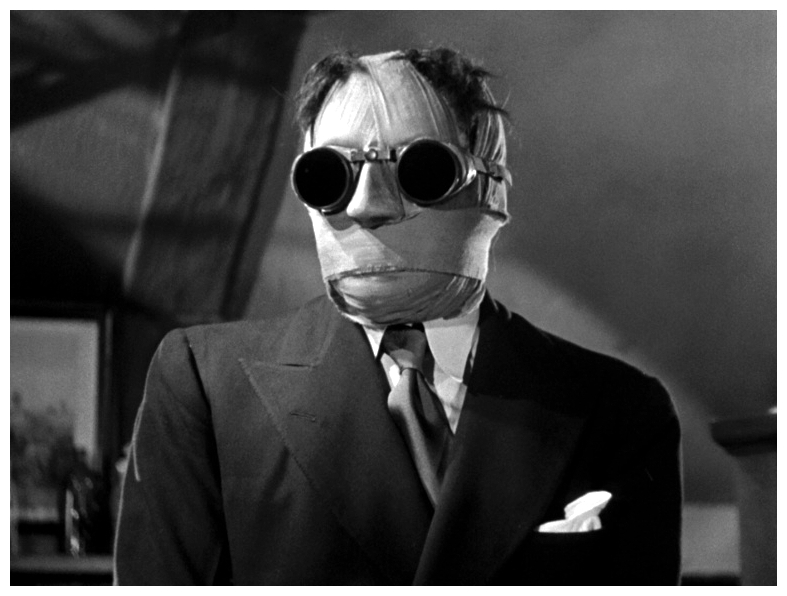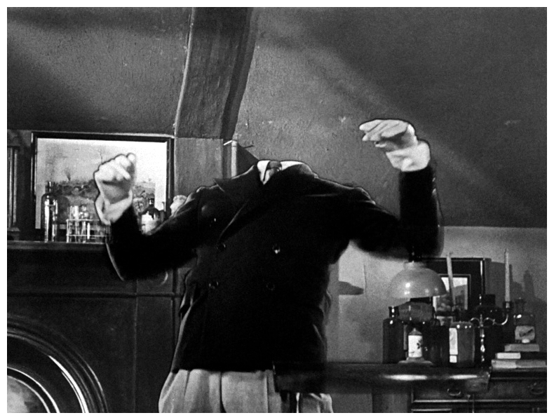 “A mysterious man, whose head is completely covered in bandages, wants a room. The proprietors of the pub aren’t used to making their house an inn during the winter months, but the man insists. They soon come to regret their decision. The man quickly runs out of money, and he has a violent temper besides. Worse still, he seems to be some kind of chemist and has filled his room with messy chemicals, test tubes, beakers and the like. When they try to throw him out, they make a ghastly discovery. Meanwhile, Flora Cranley appeals to her father to do something about the mysterious disappearance of Doctor Griffin, his assistant and her sweetheart. Her father’s other assistant, the cowardly Doctor Kemp, is no help. He wants her for himself. Little does Flora guess that the wild tales, from newspapers and radio broadcasts, of an invisible homicidal maniac are stories of Doctor Griffin himself, who has discovered the secret of invisibility and gone mad in the process.” (courtesy IMDB)