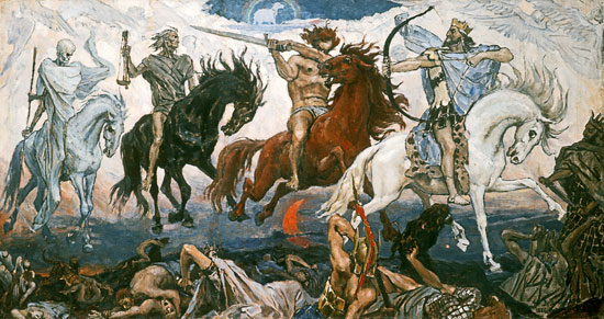 Though they appear only in 6:1 through 8:5 of the Book of Revelation, the Four Horsemen of the Apocalypse are one of the most enduring, and most feared, aspects of St. John’s vision. For Biblical literalists, the Four Horsemen are real figures, part of a future apocalypse predicted by the exiled St. John, in which war, famine, disease, and death will visit those who do not follow the Christian god. For scholars and skeptics, they are part of the larger allegory St. John constructed for believers persecuted by the Roman government. It was essential that early Christian leaders give their readers hope for Rome’s harsh judgment by God for its injustices against them, lest believers decide to reject the new religion altogether.