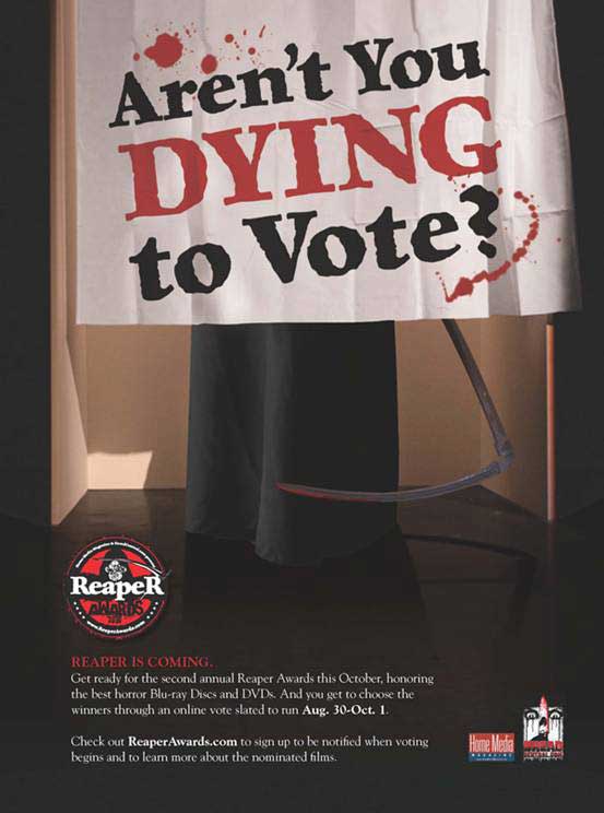YAY ME! Dreadcentral.com is having their 2nd “Reaper Awards”, which honours the best of the best in horror Blu-Ray’s and DVD’s! And yes, I needed to put it in because I’m “The Reaper” and what I say goes, okay? (That’s just me being silly again.) It’s coming in October and your online vote counts as to who’ll be winning what. Check out www.reaperawards.com and sign up to be notified for when voting will start. You know you want to… even if it’s just for little old me…