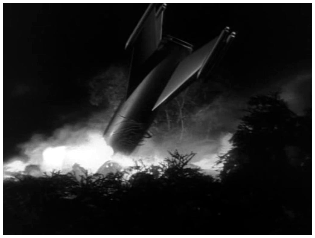 The film begins with a rocketship hurtling out of the night sky and burying itself nose-first in a field behind a farm house. Police, fire brigade and sightseers quickly arrive at the scene of the crash, among them Professor Quatermass, the man in charge of Britain’s first attempted flight into space. He takes control and orders the firemen to aim their hoses around the hatchway so that the astronauts will have some protection from the heat of the ship’s hull when they emerge. The door is opened by remote control and a figure slowly emerges, one of the three astronauts inside the ship. He stumbles and falls, and is quickly placed on a stretcher and taken to an ambulance. Quatermass and the others find no sign of the other two astronauts, but they do find their spacesuits. However, both of them are empty, yet linked up in such a way as to suggest that the men disappeared while wearing them.