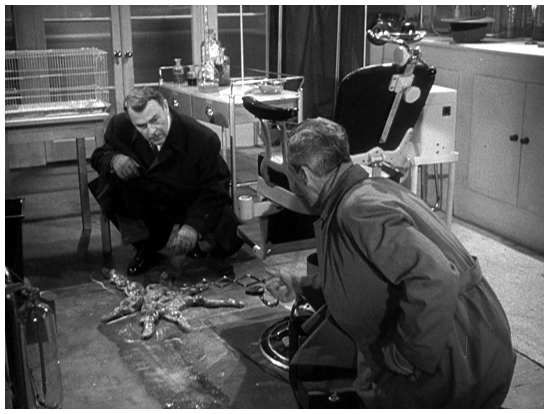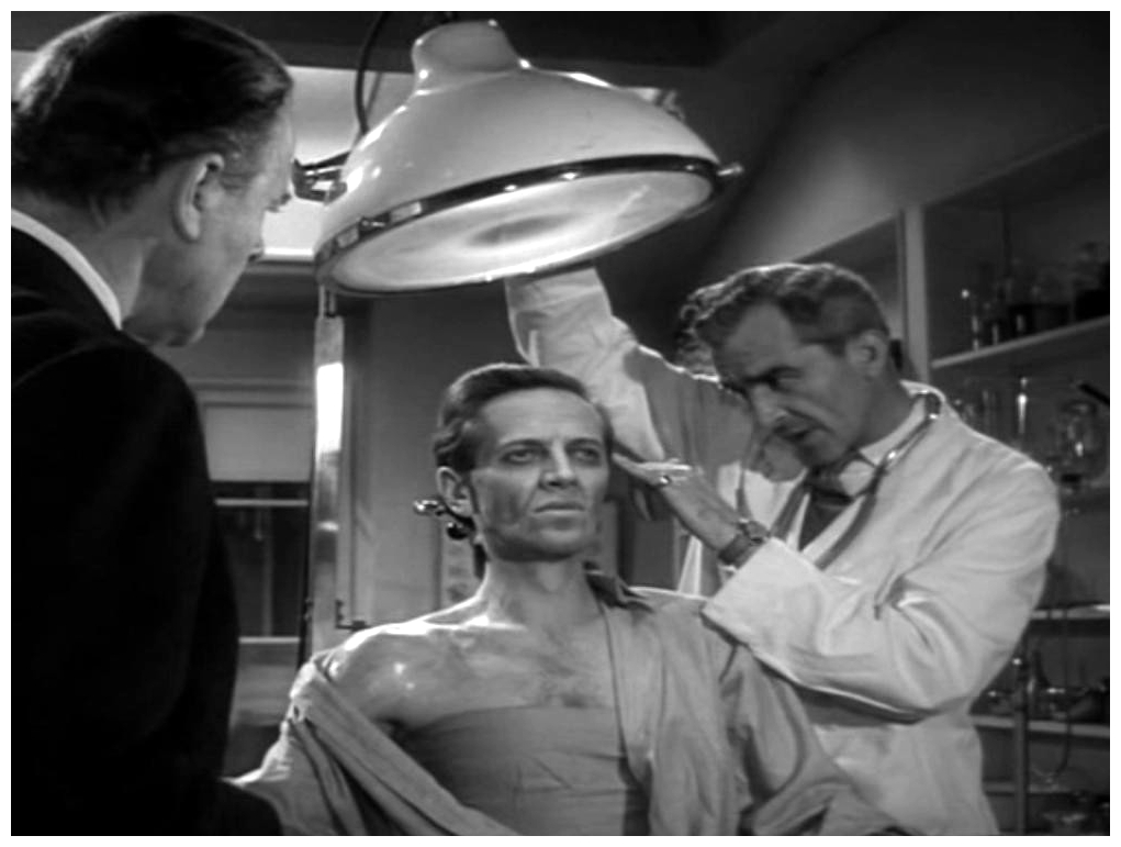 After this effective beginning, the film continues its build-up of unease. The surviving astronaut, Victor Carroon (Richard Wordsworth), is apparently in the grip of a strange disease. After saying just two words (“Help me!”) he can no longer communicate with anyone, even his wife Judith (Margia Dean), and his skin is beginning to undergo a transformation. Even his bone structure is changing and, in the hospital, the process of change enters a new phase – he absorbs a cactus plant into his arm which takes on the appearance of a large shapeless mass covered with spikes. He escapes from the hospital and staggers off into the night, an emaciated tortured figure who is still partly human and terrified by what he knows he is becoming. When he is finally tracked down in Westminster Abbey, the metamorphosis is complete and he has become a large pulsating octopus-like creature, totally unrecognisable as a human being. Quatermass arranges to have him electrocuted before he can discharge a number of spores into the air. Soon after the creature’s dying screams are heard, Quatermass announces he’s going to launch another rocket as soon as possible.